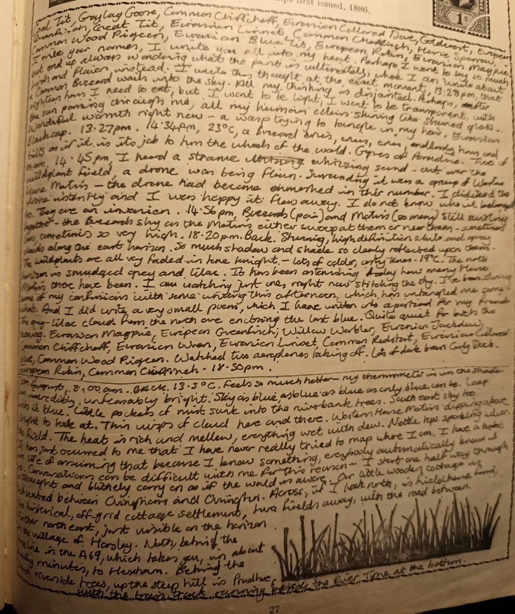 I write your names, I write you all into my heart. Perhaps I want to say so much but end up always wondering what the point is ultimately, when I can write about birds and flowers instead. I write this thought at the exact moment, 13.23 p.m., that a Common Buzzard wails into the sky. All my thinking is disjointed. Perhaps, after eighteen hours I need to eat, but I want to be light, I want to be transparent, with the sun passing through me, all my human colours shining like stained glass. Wonderful warmth right now – a wasp trying to tangle in my hair. Eurasian Blackcap, 13.27 p.m.