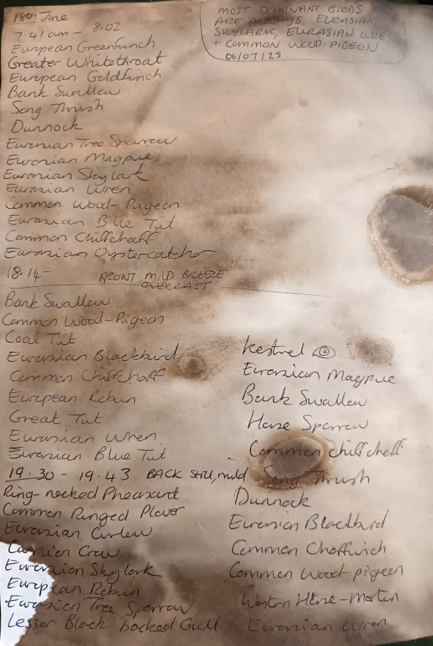 European Greenfinch, Greater Whitethroat, European Goldfinch, Bank Swallow, Song Thrush, Dunnock, Eurasian Tree Sparrow, Eurasian Skylark, Eurasian Wren, Common Wood-pigeon, Eurasian Blue Tit, Common Chiffchaff, Eurasian Oystercatcher.