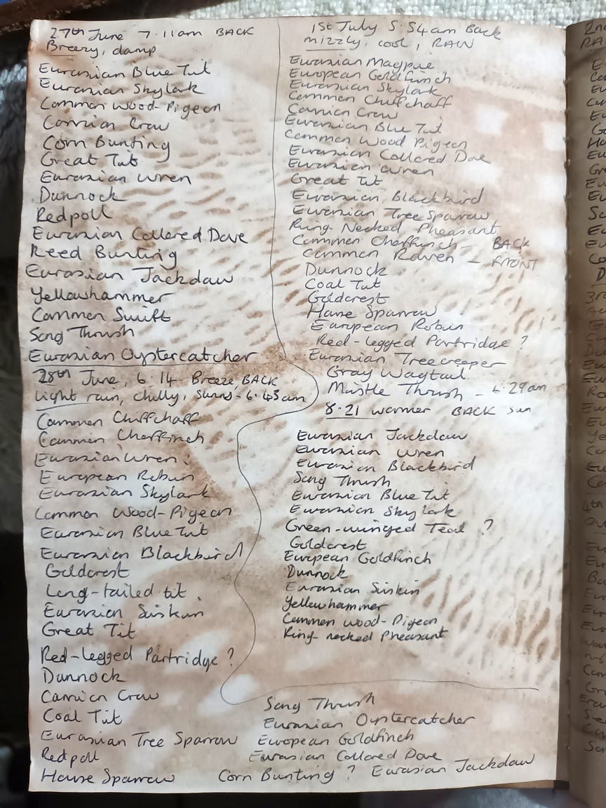 Eurasian Blue Tit, Eurasian Skylark, Common Wood-Pigeon, Carrion Crow, Corn Bunting, Great Tit, Eurasian Wren, Dunnock, Redpoll, Eurasian Collared-Dove, Reed Bunting, Eurasian Jackdaw, Yellowhammer, Common Swift, Song Thrush, Eurasian Oystercatcher.