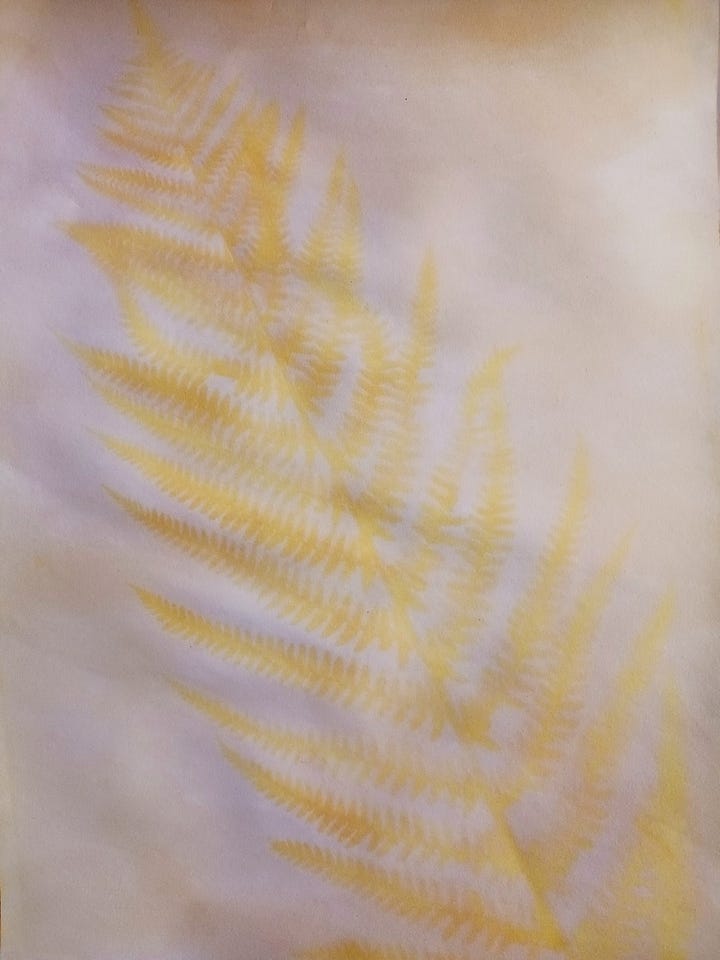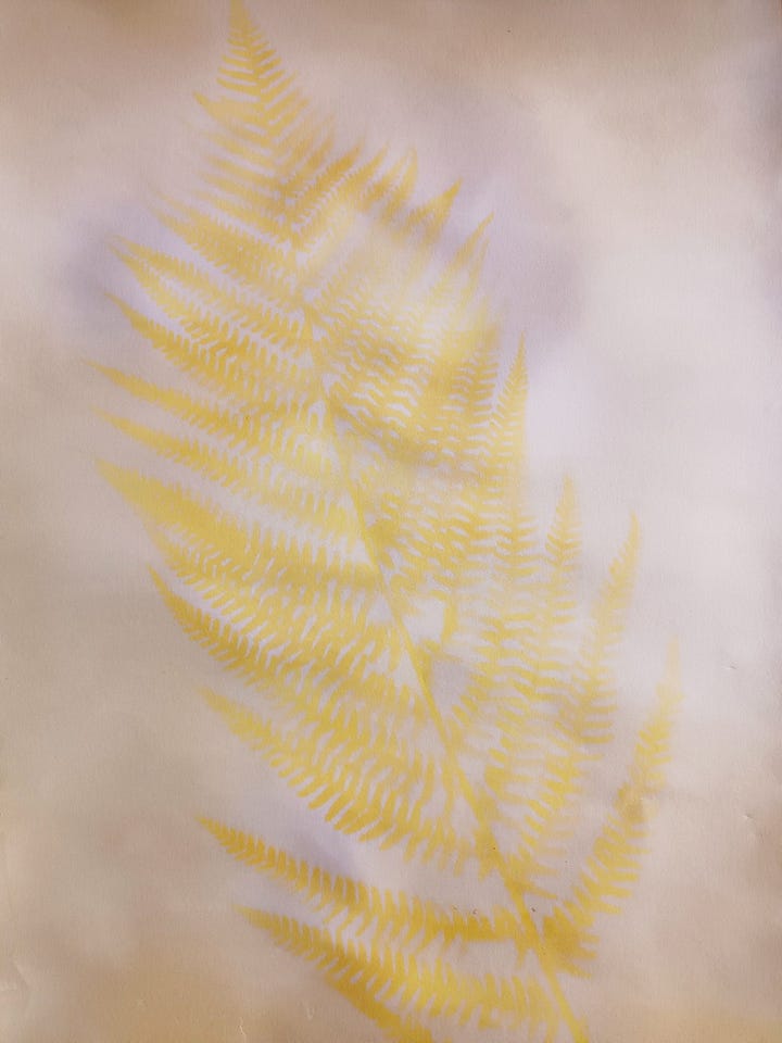 My heart pounded at this epiphany. I was looking like I had never looked before. This was another tool to use in my noticing. My noticing would be better because of this knowledge. I know I am not the first person to arrive at this discovery, but for a few days I felt secret, special, blessed. I have continued to experiment and paint flowers since, and this increased potential for noticing feels so valuable. One of my experiments can be seen at the beginning of this article – I used sun-printing with turmeric dye to make studies of two bracken leaves and was thrilled with the capturing of their silhouettes.