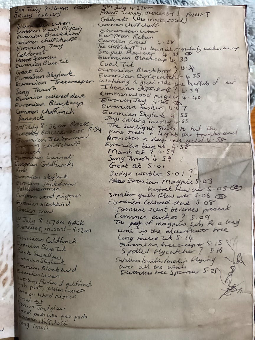 Iberian Chiffchaff 4.39 a.m (? probably not - it is a rare visitor) only rarely spotted in the UK), Common Wood-Pigeon 4.40 a.m., Eurasian Jay 4.45 a.m., Eurasian Siskin, 4.47 a.m., Eurasian Skylark 4.55 a.m.