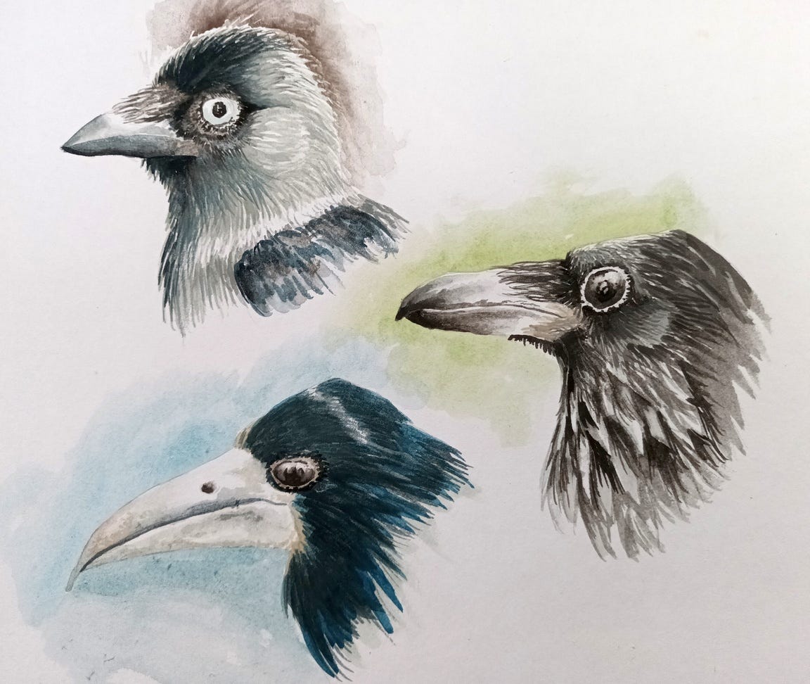 I was glad I had taken the time to study differences in corvids, and no longer lump them all together as ‘crows’. They are so different. I made a study of the heads of a Jackdaw, a Rook and Carrion Crow, setting them close together so their unique characteristics become more pronounced.