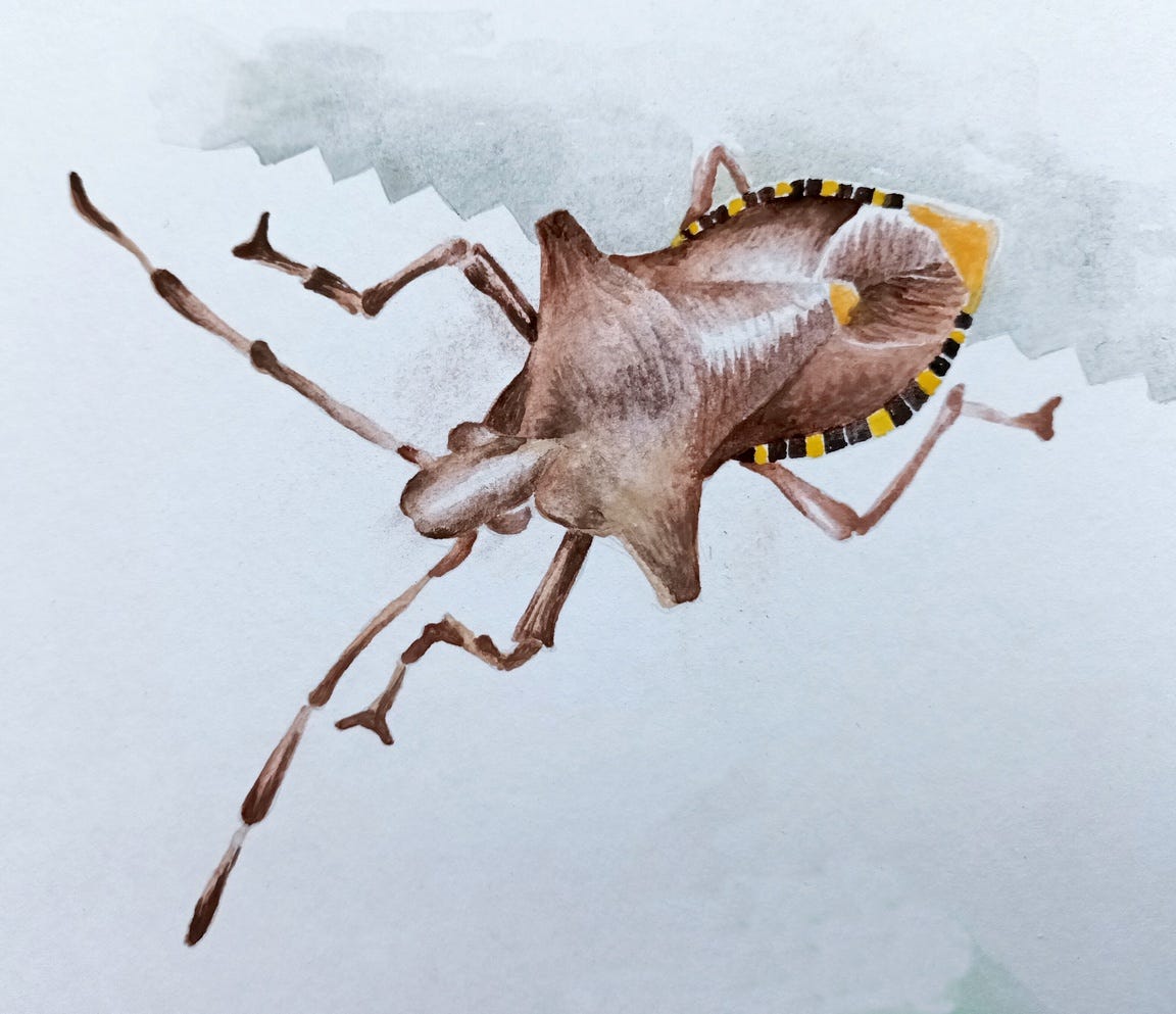 *Research has told me that this was a type of Shield Bug, known as Forest Bug, also known as Red-legged Shield Bug. Adults can be seen from July, and it lives in woodland and gardens. It feeds upon deciduous tree sap. And trees there are a-plenty here. Its decorative trim was amazing – so distinctive. I have attempted a painting of it, to ensure I squeezed as much observation from the encounter as possible.