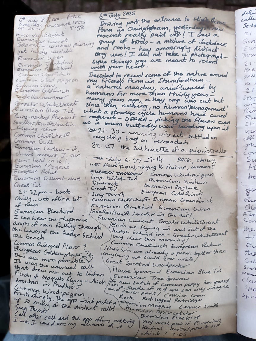 Eurasian Skylark, Eurasian Linnet, Goldcrest (somehow piercing yet hardly audible), Eurasian Wren, Eurasian Jackdaw, Common Chaffinch, Common Wood Pigeon, Carrion Crow, European Goldfinch, Yellowhammer, Greater Whitethroat, Eurasian Blue Tit, Ring-necked Pheasant, Swallow/Swift/Martin flying above, Common Chiffchaff, Common Gull, Eurasian Curlew (oh, elusive moment I can never hold on to!), Eurasian Magpie, European Robin, Eurasian Collared Dove, Great Tit.