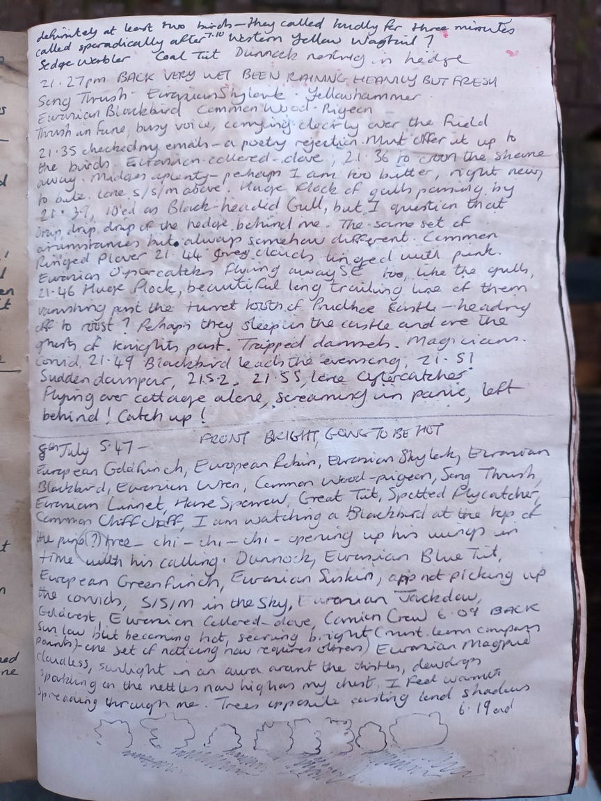 Corvid 21.49 p.m. Blackbird leads the evensong, 21.51 p.m. Sudden downpour 21.52 p.m. 21.55 p.m., lone Oystercatcher flying over cottage alone, screaming in panic, left behind! Catch up!