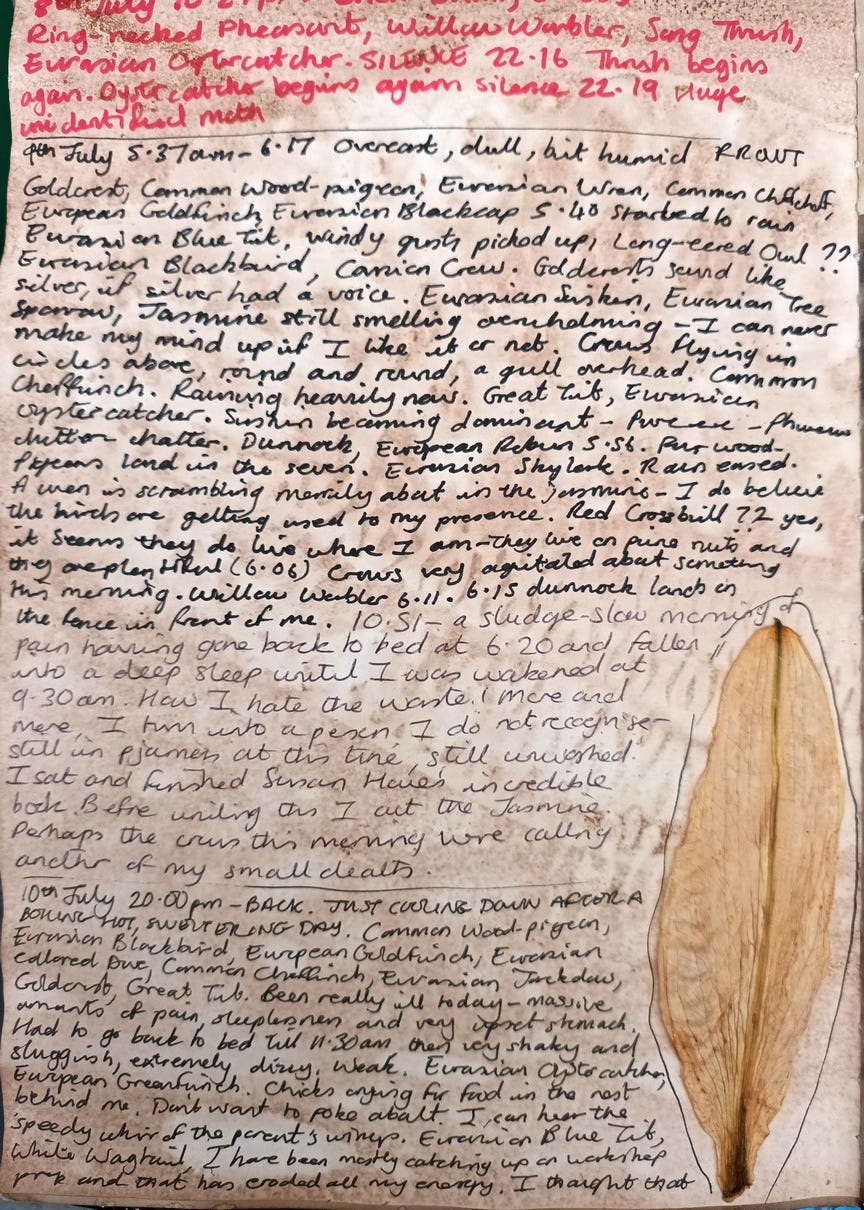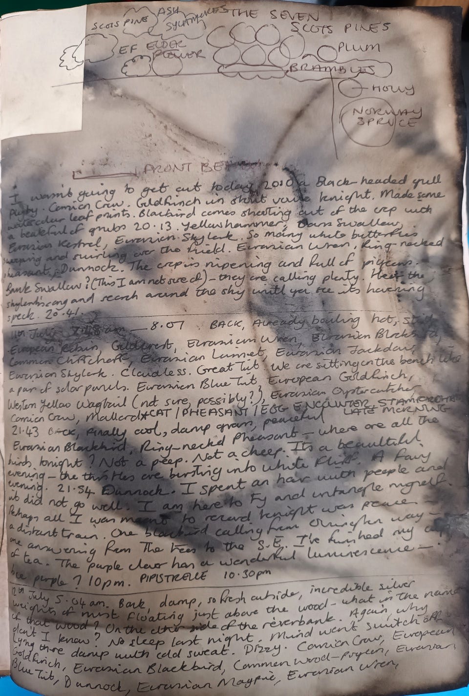 12th July 5.04 a.m. Back. Damp, so fresh outside, incredible silver weights of mist floating just above the wood – what is the name of that wood? On the other side of the riverbank. Again, why don’t I know (if there is a local name for this area of trees, I do not know it and map research brings up nothing. It is a substantial wood that runs along the other side of the river for a few miles)? No sleep last night. Mind won’t switch off. Lying there damp with cold sweat. Dizzy.